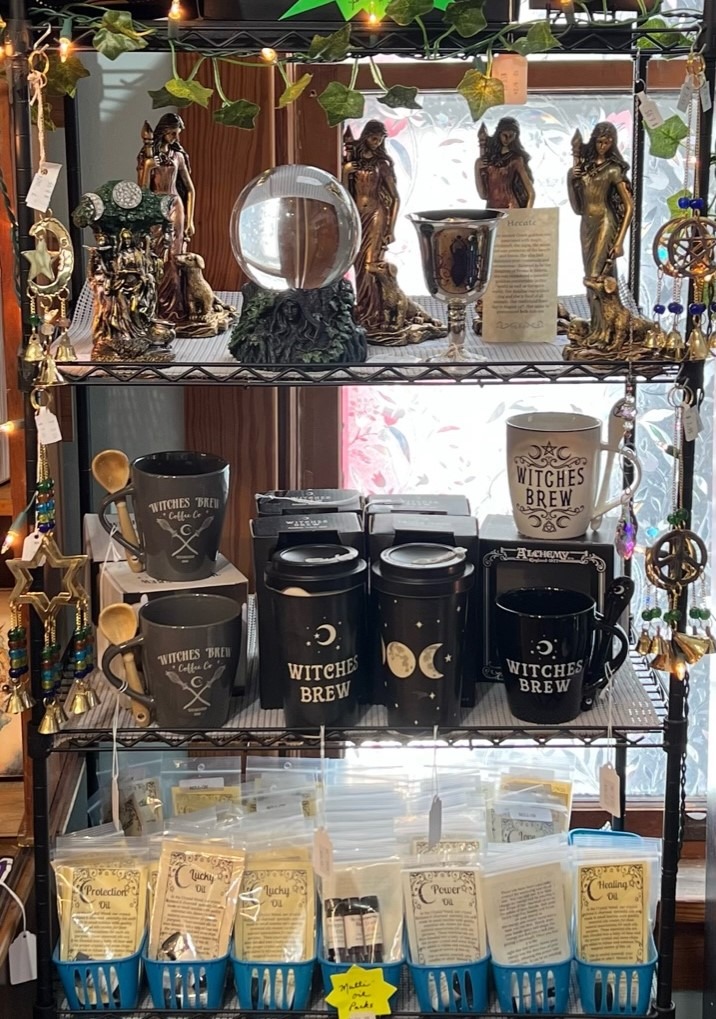 Our back room offers an array of bagged herbs & botanicals as well as a rainbow of colored chime and 6" candles for all your ritual needs. We've got bells, wands, journals, altar cloths and so many other items to delight and charm you(including pre-made spell kits!) Our own selection of specialty oils are made on site in small batches, by the experienced hand of Tracey, (she knows her stuff!)
